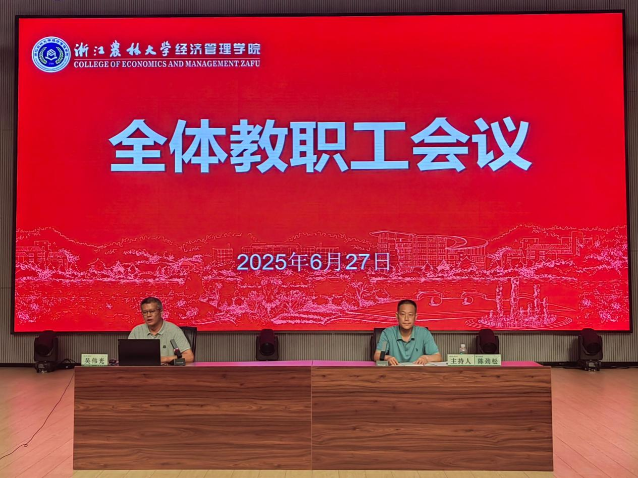 best365手机版官方网站召开全体教职工大会 6月27日下午,学院在衣锦校区报告厅召开全体教职工大会。学院全体教职工参加了会议,会议由党委书记陈劲松主持。院长吴伟光指出,2025年是“十四五”收官之年和“十五五”谋篇布局之年,学院要重点做好三方面工作:一是重视人才和团队建设,强化有组织科研,聚焦乡村振兴、数字经济等国家战略需求,打造高水平创新团队;二是夯实教学根基,加强基层教学组织建设,充分发挥课程组、教学团队在教学质量提升中的关键作用,全面提升...