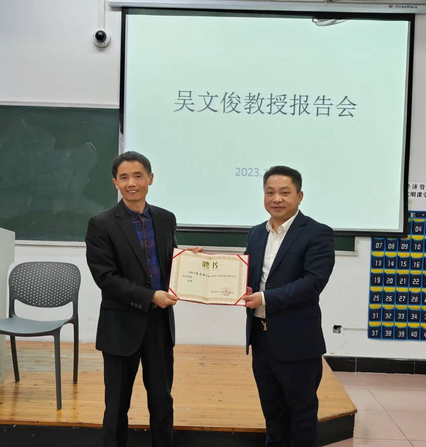 11月30日下午,琦星智能科技有限公司副董事长吴文俊先生受聘为best365手机版官方网站兼职教授暨报告会在教学主楼201教室举行。best365手机版官方网站企业管理学科负责人张国庆教授为吴文俊教授颁发聘任证书。