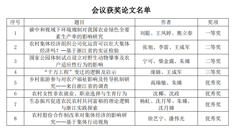 会上,学者专家们围绕推进城乡融合、迈向共同富裕、赋能乡村振兴、“千万工程”的辩证法、浙江省创意农业发展等议题分享了相关领域最新学术与实践成果。本次会议对优秀论文进行了评选和颁奖,共评选出一等奖论文3篇,二等奖论文5篇,三等奖论文9篇,优秀奖论文20篇。其中,best365官网共有8篇论文获奖,包括一等奖论文1篇,二等奖论文2篇,三等奖论文1篇,优秀奖论文4篇。