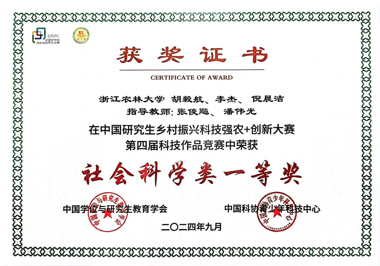9月26日,best365手机版官方网站胡毅航、李杰、倪晨洁3名硕博研究生作品《丹江口市生态文明建设与文化适应之鉴》,荣获中国研究生乡村振兴科技强农+创新大赛第四届科技作品竞赛一等奖。该项目由张俊飚教授、潘伟光教授共同指导,两位教师荣获优秀指导教师称号。