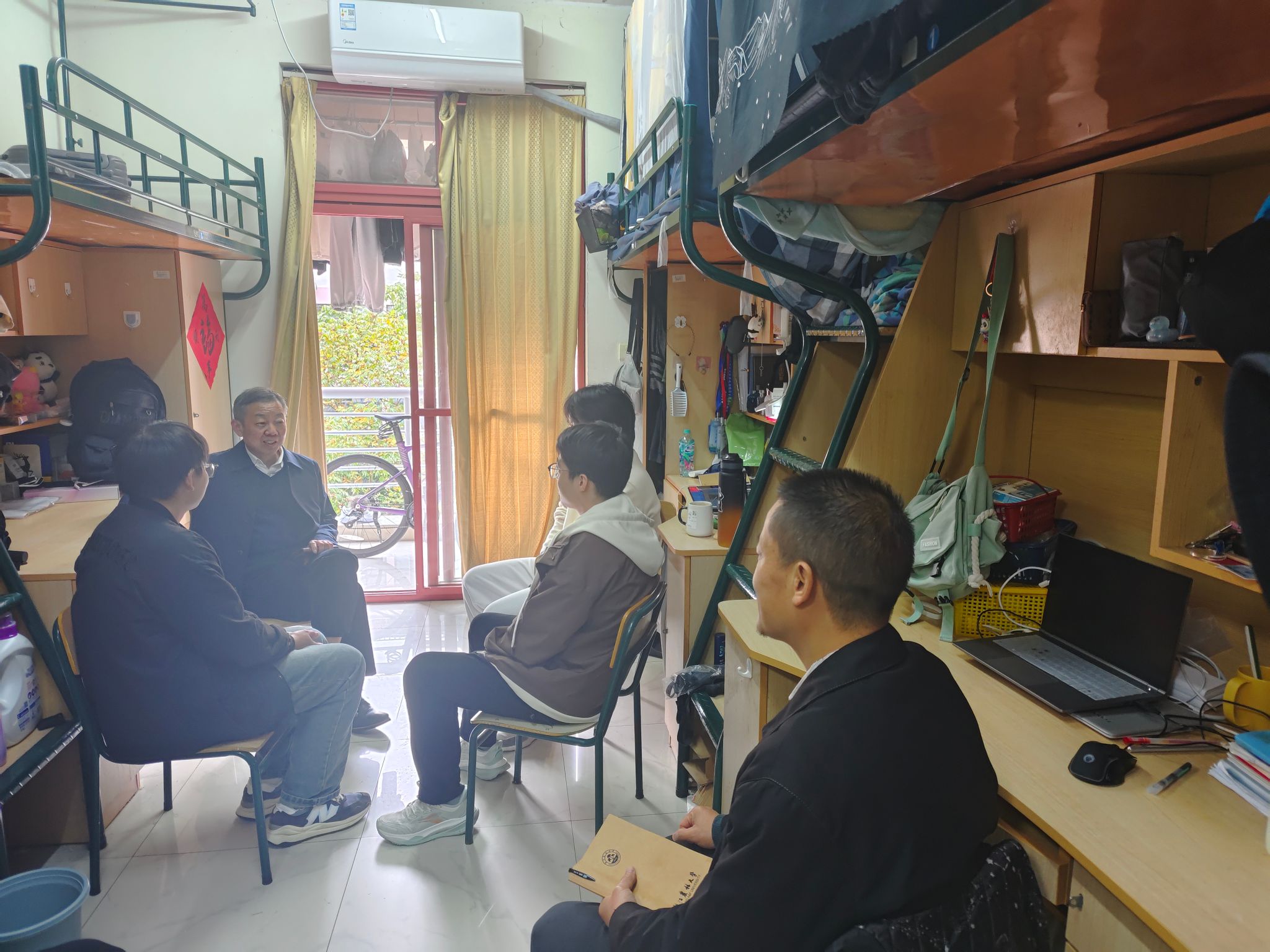 在走访学生寝室时,吴家胜详细听取了同学们在学习、生活、科研和就业等方面的情况和困惑。吴家胜表示,个人发展与学校发展是一个命运共同体,学校会不遗余力培养每一位学生,同学们要志存高远、敢担当作为、做出学术成就,相互影响、相互促进;要做好示范、树立优秀榜样,带动身边同学和班级共同形成良好的学风,养成良好的习惯;要多思考、多实践,全方位、多角度看待社会现象和社会问题,形成自己独特的思维逻辑。