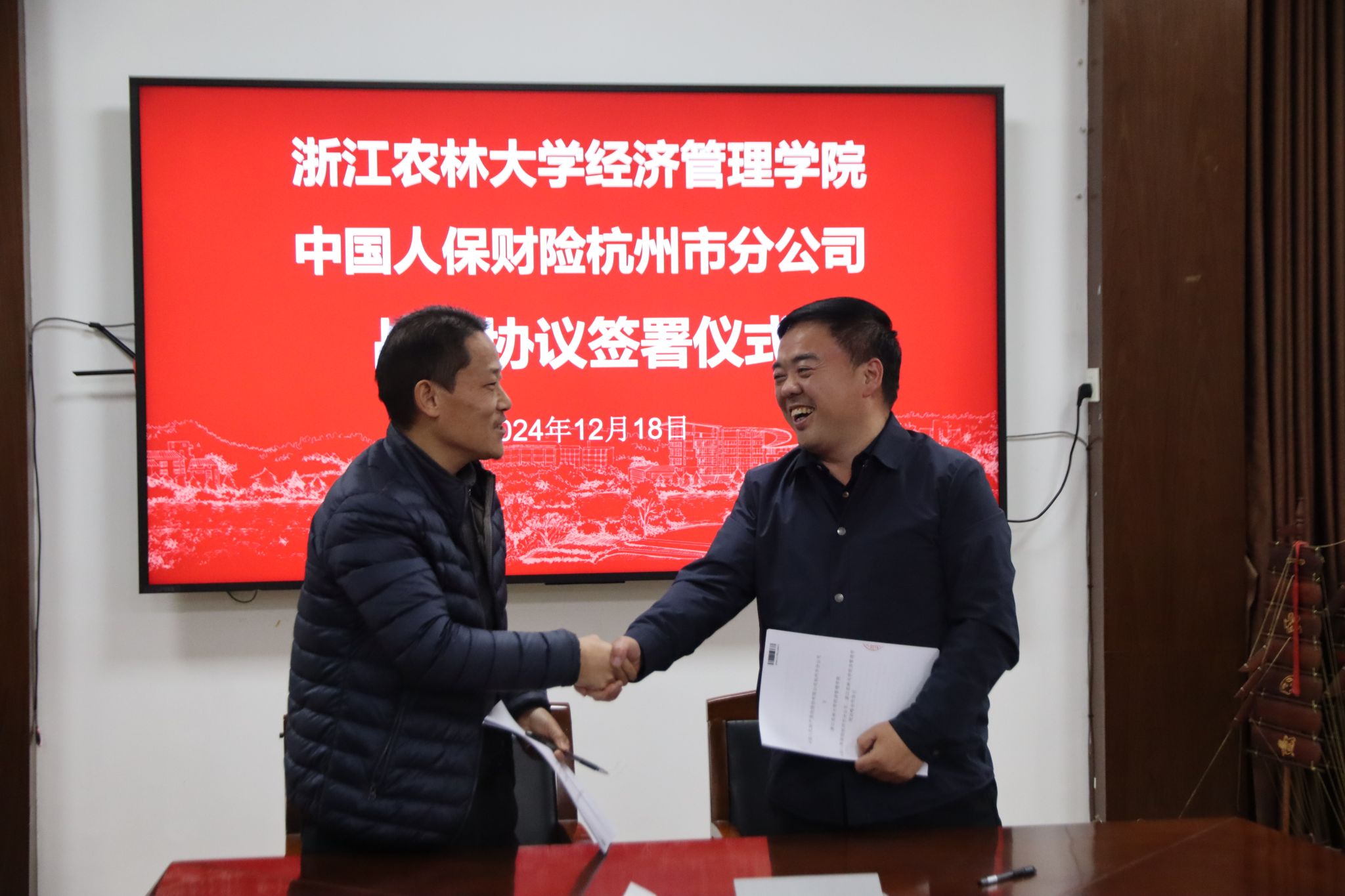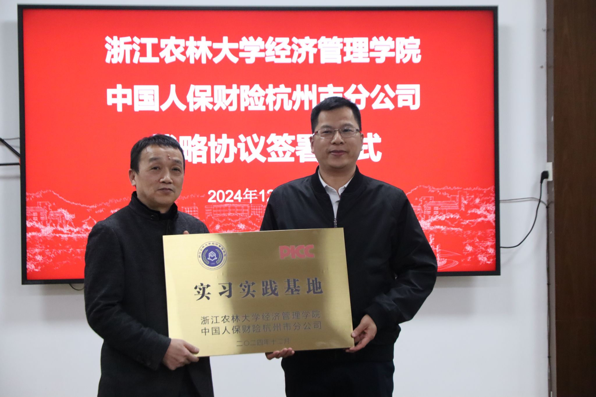 12月18日下午,best365手机版官方网站与中国人保财险杭州市分公司战略合作协议签约暨实习实践基地授牌仪式在西大楼208会议室举行。中国人保财险杭州市分公司副总经理詹春林、best365手机版官方网站党委书记陈劲松,双方团委、学科专业、行政人事及学生办等相关人员,参加了仪式。