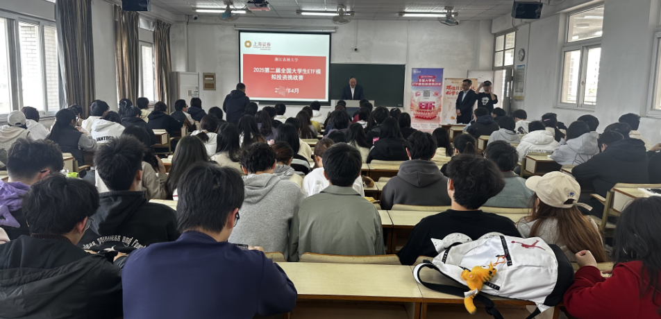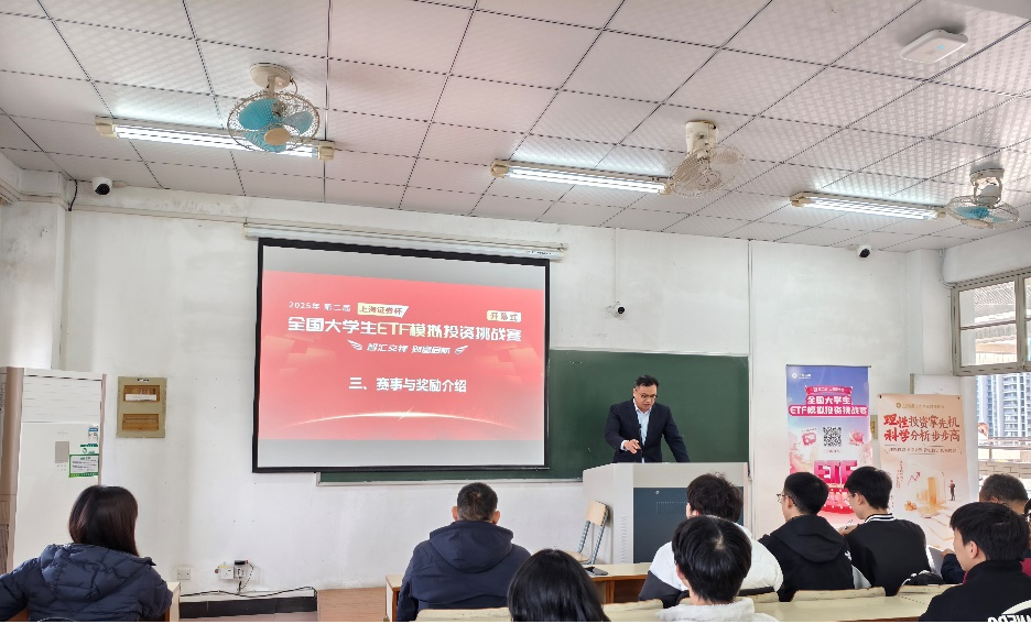 再次,上海证券有限责任公司杭州学院路证券营业部市场总监狄劲松对“第二届全国大学生ETF模拟投资挑战赛”的活动口号、主办单位、协办单位、时间规划、参赛流程以及赛事奖励等进行了详细介绍,并鼓励各位同学积极参赛,增强自身投资体验感。