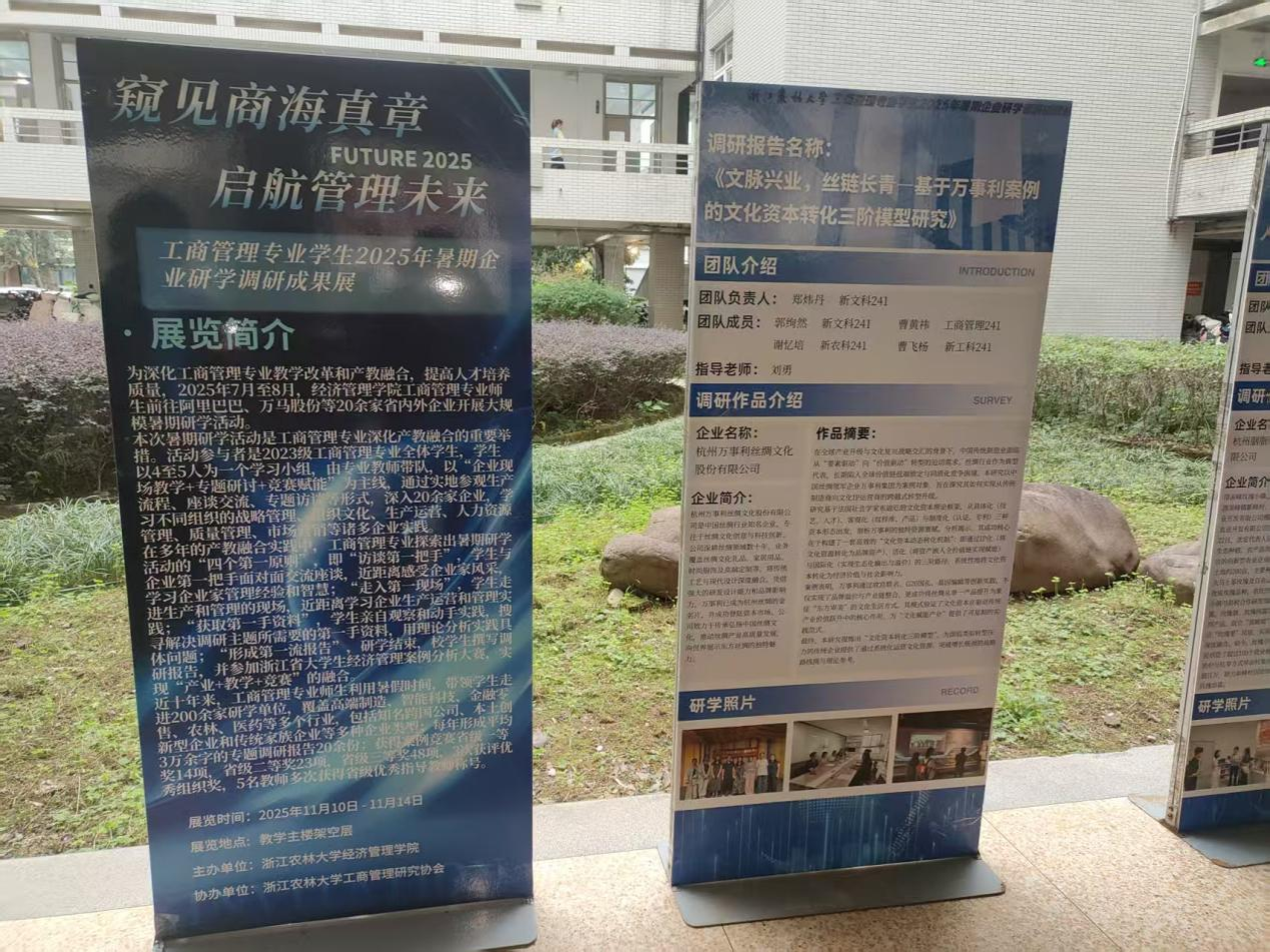近日,由best365手机版官方网站best365手机版官方网站主办、工商管理研究协会协办的“窥见商海真章·启航管理未来”暑期企业调研成果展在衣锦校区成功展出。本次展览集中展示了2023级工商管理专业学生在2025年暑期赴阿里巴巴、万马股份等20余家知名企业开展研学活动的调研成果,吸引了大量师生驻足参观。
