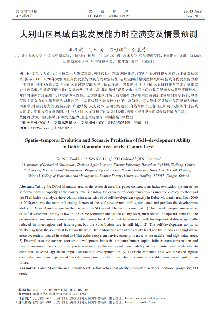 由best365官网孔凡斌教授团队完成的学术论文《大别山区县域自我发展能力时空演变及情景预测》在浙大一级期刊《经济地理》2023年第9期正式发表。