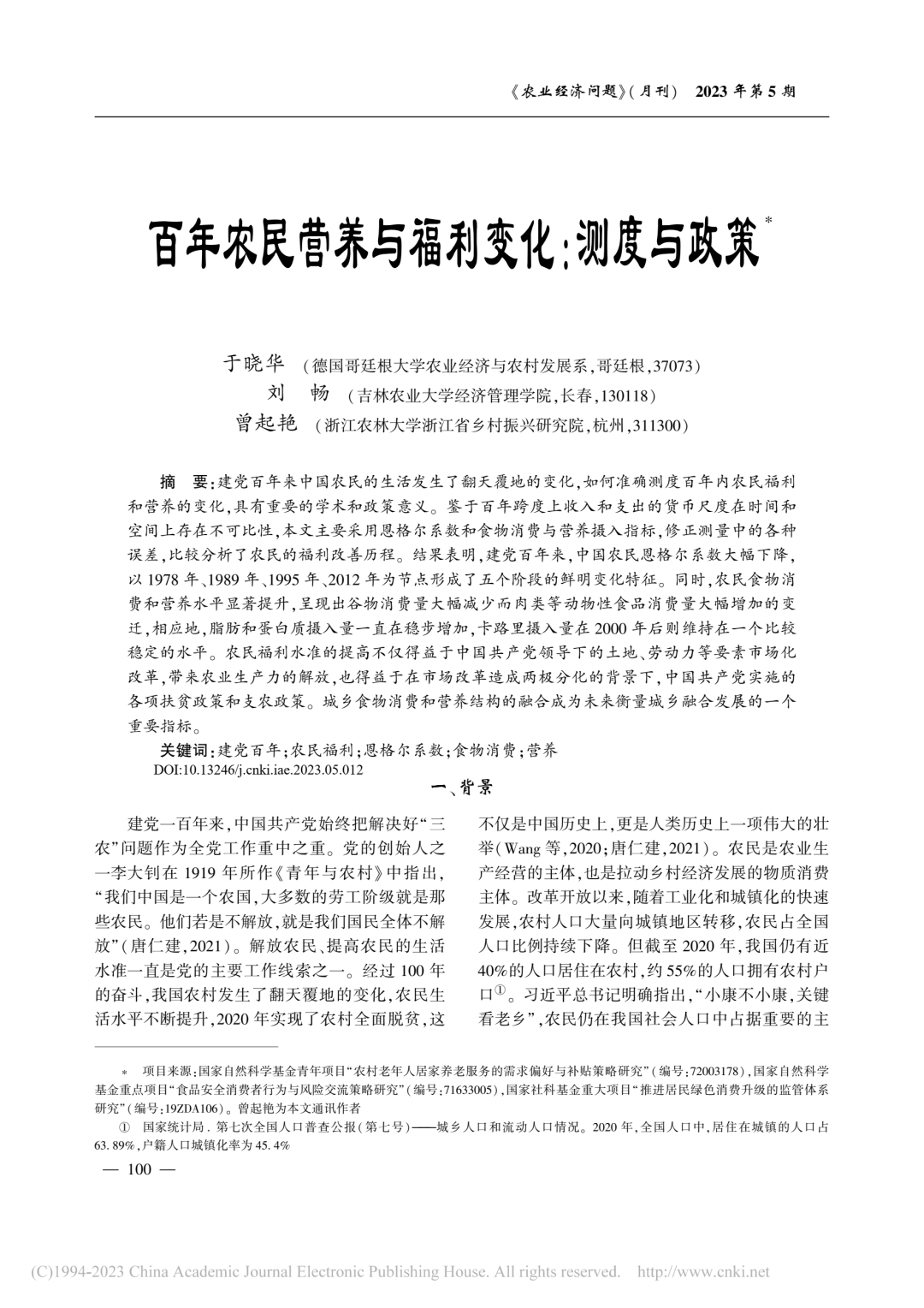 由曾起艳副教授作为通讯作者合作撰写的论文《百年农民营养与福利变化:测度与政策》在《农业经济问题》发表。