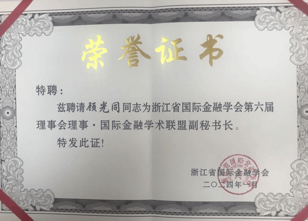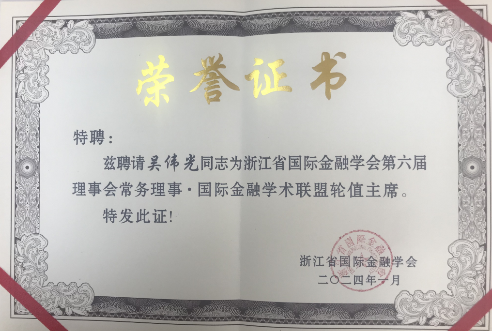吴伟光教授与顾光同教授受聘为浙江省国际金融学会常务理事、理事和国际金融学术联盟轮值主席、副秘书长