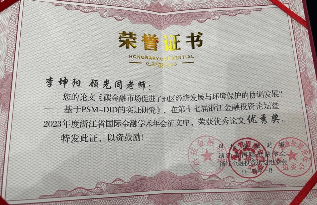 大会还举行了2023年度学术成果优秀论文颁奖仪式。本次征文收到来自浙江大学、浙江工商大学、best365手机版官方网站等多所省内外高校专家学者的论文投稿,顾光同教授指导的农业管理研究生李坤阳撰写的论文《碳金融市场促进了地区经济发展与环境保护的协调发展?——基于PSM-DID的实证研究》荣获优秀论文优秀奖。