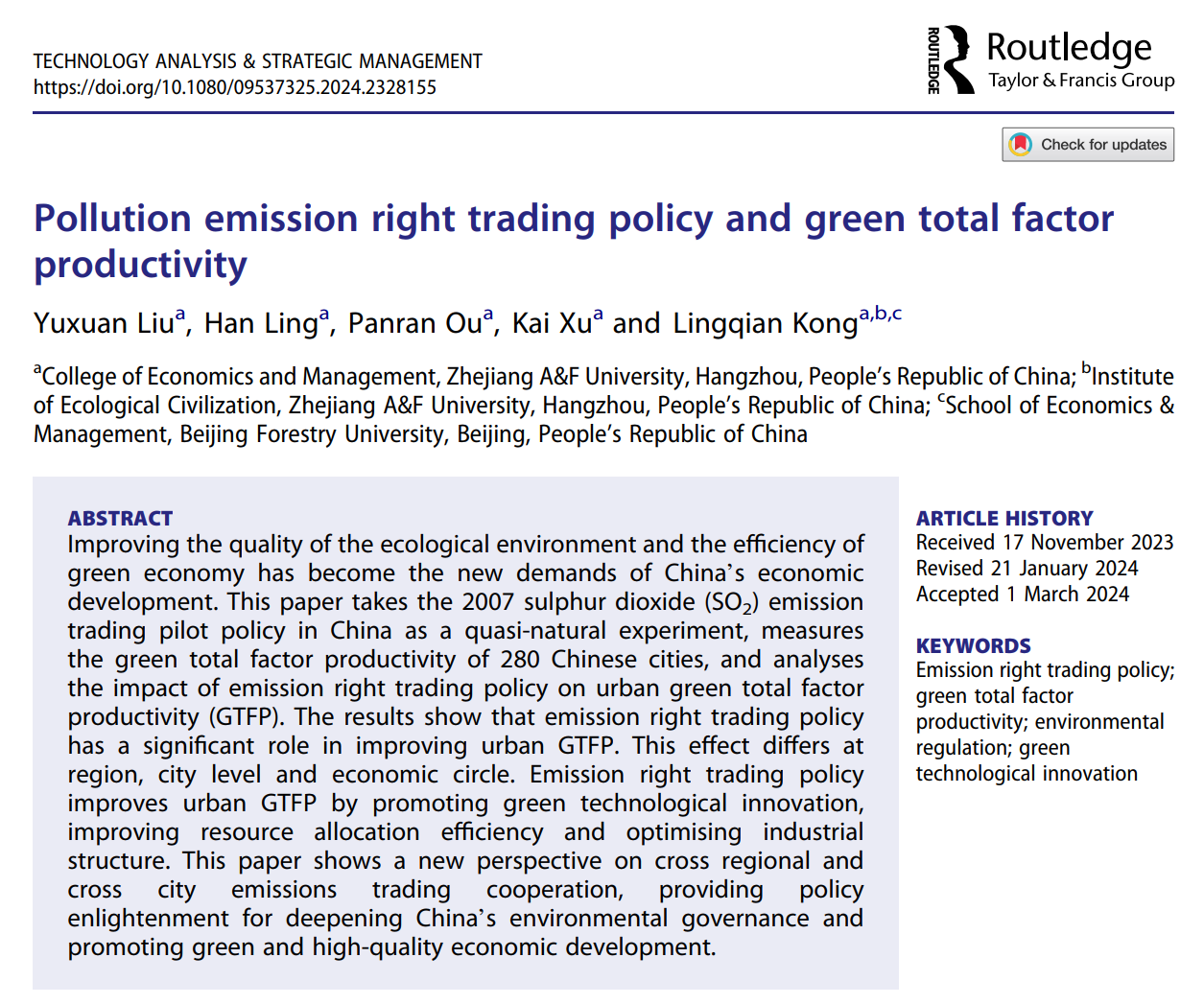 近日,由best365手机版官方网站2020级国贸专业本科生刘雨璇、凌涵和欧盼苒共同撰写的学术论文《Pollution emission right trading policy and green total factor productivity》在《Technology Analysis & Strategic Management》上发表,该期刊为SSCI收录期刊、ABS2星,论文通讯作者为国贸系孔令乾老师。该论文是孔令乾老师指导的浙江省大学生科技创新活动计划(新苗人才计划)“排污权交易机制对企业绿色全要素生产率的影响机理与对策研究”的阶段性成果,同时也是沈满洪教授主持的教育部哲学社会科学研究重大专项项目“习近平生态文明思想在中国大地的生动实践研究”和国家社科基金教育学一般项目“中国式现代化背景下大学生生态文明教育研究”的阶段性成果。此外,国贸系蒋琴儿教授、钱志权教授、熊立春副教授、刘琼博士以及管工学科徐凯博士亦参与指导并提供修改建议。