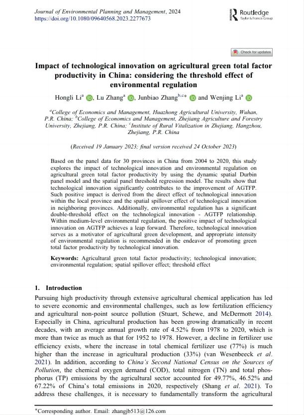 近日,张俊飚教授(通讯作者)与华中农业大学best365手机版官方网站博士生李红莉、张露教授以及李文静副教授在环境规划与管理领域著名期刊《Journal of Environmental Planning and Management》(SSCI,JCRQ2,中科院4区,IF=3.9)发表了题为“Impact of technological innovation on agricultural green total factor productivity in China: considering the threshold effect of environmental regulation”的研究论文。研究探究了技术创新对中国农业绿色全要素生产率提升的空间溢出效应,同时揭示了不同环境规制作用下技术创新对中国农业绿色全要素生产率的异质性门槛效应。