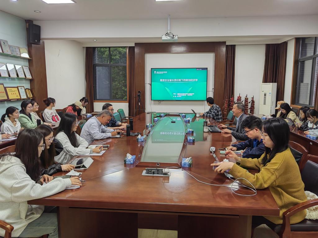 钟钰教授从高度宏观的公共管理、公共政策和顶层设计的视角来开展粮食安全省长责任制下的政治经济学研究,阐述了粮食安全供给的重要意义。随后,钟钰教授详细介绍了省长责任制的政策溯源过程,通过大量的实证数据分析,检验了省长责任制对官员晋升、粮食生产的影响,并分享了政府注意力影响粮食生产的研究方法。最后,钟钰教授与参会师生就粮食安全等进行了讨论和交流。