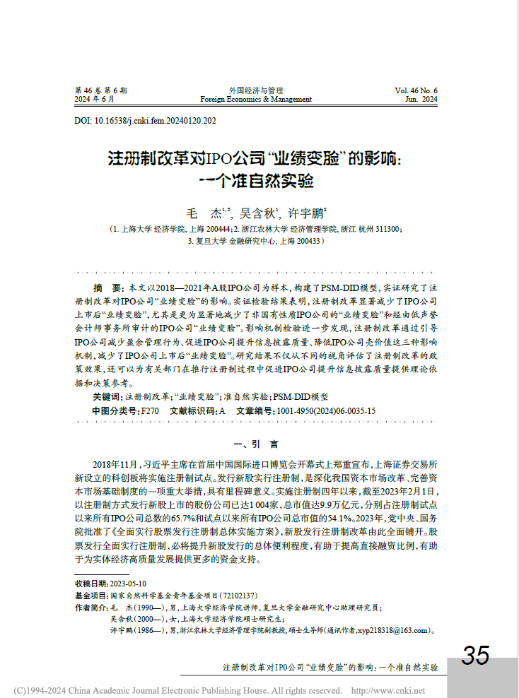由best365官网许宇鹏副教授作为通讯作者合作撰写的论文《注册制改革对IPO公司“业绩变脸”的影响:一个准自然实验》在《外国经济与管理》(学校A类期刊、CSSCI、FMS管理科学高质量期刊)2024年第6期上发表。该论文是许宇鹏副教授主持承担的国家自然科学青年基金项目的阶段性研究成果。