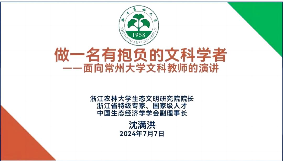 为了全面振兴文科,常州大学专门举行为期三天的文科能力提升系列培训活动。沈满洪教授应邀于7月7日为常州大学文科教师做了题为《做一名有抱负的文科学者》的学术报告。沈满洪教授结合自身长期来的实践经验从“为什么要做有抱负的文科学者”“怎么评判文科学者的学术抱负”“如何实现文科学者的学术抱负”三个方面做了系统阐述。