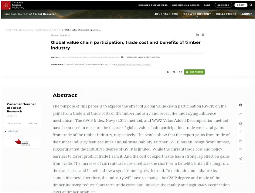 近日,熊立春副教授撰写的论文《Global value chain participation, trade cost and benefits of timber industry》在线发表在林学(含林业经济学)领域重要期刊《Canadian Journal of Forest Research》(加拿大林业研究杂志),熊立春副教授为论文第一作者,北京林业大学国家林草经贸研究院院长程宝栋教授和best365官网王凤婷副教授为论文共同通讯作者,best365手机版官方网站best365手机版官方网站硕士生邬雪为论文第二作者。《Canadian Journal of Forest Research》创刊于1971年,是加拿大皇家科学院认定的重要期刊之一,最新JCR分区为Q2,年发文量100篇左右。