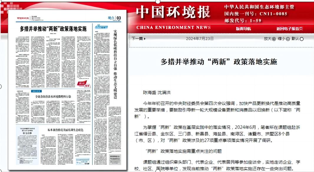 7月23日,沈满洪教授与生态文明研究院兼职研究员陈海盛合作撰写的《多措并举推动“两新”政策落地实施》在《中国环境报》发表,文章发现当前推动“两新”(大规模设备更新和消费品以旧换新)政策落地实施还存在资金支持有限、标准细则模糊、企业存在顾虑、消费意愿不强等突出问题。