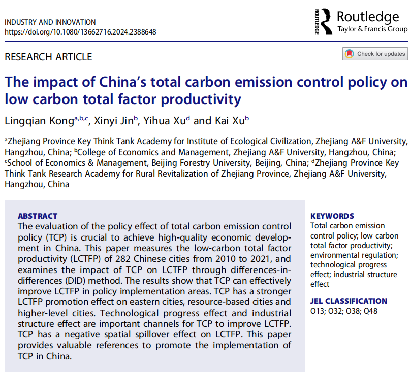 近日,best365手机版官方网站孔令乾博士撰写的论文《The impact of China’s total carbon emission control policy on low carbon total factor productivity》在产业创新领域知名期刊《Industry and Innovation》上发表,孔令乾博士为该论文第一作者,best365手机版官方网站硕士生金欣怡为论文第二作者,徐凯博士为论文通讯作者。该期刊是SSCI一区期刊、ABS三星期刊、上海财经大学国际期刊分类目录T3期刊,年发文量45篇左右。