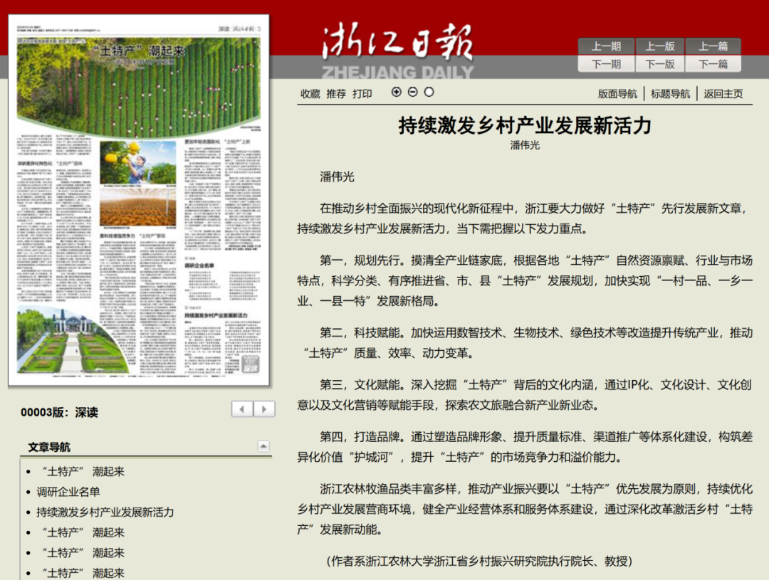 潘伟光教授关于“土特产”专家点评文章在《浙江日报》发表