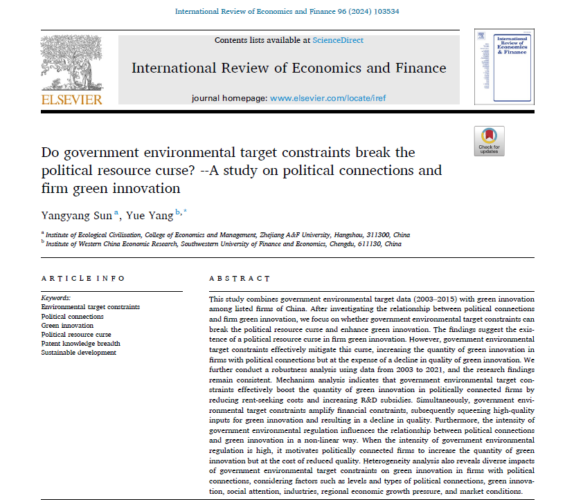 近日,best365官网应用经济学学科孙阳阳博士撰写的论文《Do government environmental target constraints break the political resource curse?—A study on political connections and firm green innovation》上发表,孙阳阳博士为该论文第一作者。该期刊是SSCI一区期刊,最新影响因子为4.8。