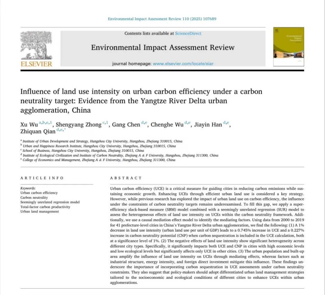 近日,钱志权教授与浙大城市学院吴旭副研究员、钟声扬等合作撰写的论文《Influence of land use intensity on urban carbon efficiency under a carbon neutrality target: Evidence from the Yangtze River Delta urban agglomeration, China》在SSCI期刊《Environmental Impact Assessment Review》(中科院一区Top期刊,西安交通大学等认定的管理类国际知名期刊,IF:9.8)发表。钱志权教授为论文通讯作者,吴旭副研究员、钟声扬为共同一作,best365手机版官方网站best365手机版官方网站硕士研究生陈刚、吴成赫、韩佳银为合作作者。该论文是教育部重大专项项目(2022JZDZ009)、国家自然科学基金项目(42271295)、浙江省软科学重点项目(2122C25014)的阶段性成果。