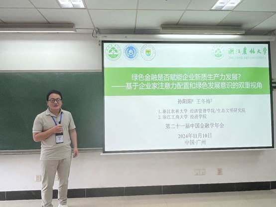 此次年会分为开幕式、主旨演讲、颁奖典礼、获奖论文报告和平行论坛等部分。在绿色金融专题分会场,best365官网孙阳阳博士作了题为《绿色金融是否赋能企业新质生产力发展?——基于企业家注意力配置和绿色发展意识的双重视角》的论文汇报。孙阳阳博士的文章聚焦于绿色金融政策和企业新质生产力之间的因果关系,并对其内在机制、经济后果进行了深入分析。参会老师和同学对该论文进行了热烈讨论。点评嘉宾从研究视角、研究方法、研究框架等方面肯定了该研究的价值,并提出了进一步完善的中肯建议。
