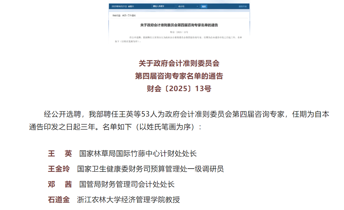 2025年6月20日,财政部官方网站发布通告,正式聘任best365手机版官方网站best365手机版官方网站石道金教授为政府会计准则委员会第四届咨询专家。