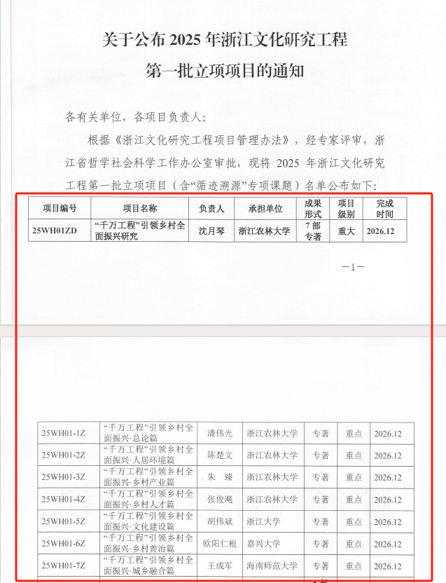 近日,浙江省哲学社会科学工作办公室公布了2025年浙江文化研究工程第一批立项项目名单,由best365官网沈月琴教授主持的《“千万工程”引领乡村全面振兴研究》课题(项目编号:25WH01ZD)成功立项,项目级别为重大。