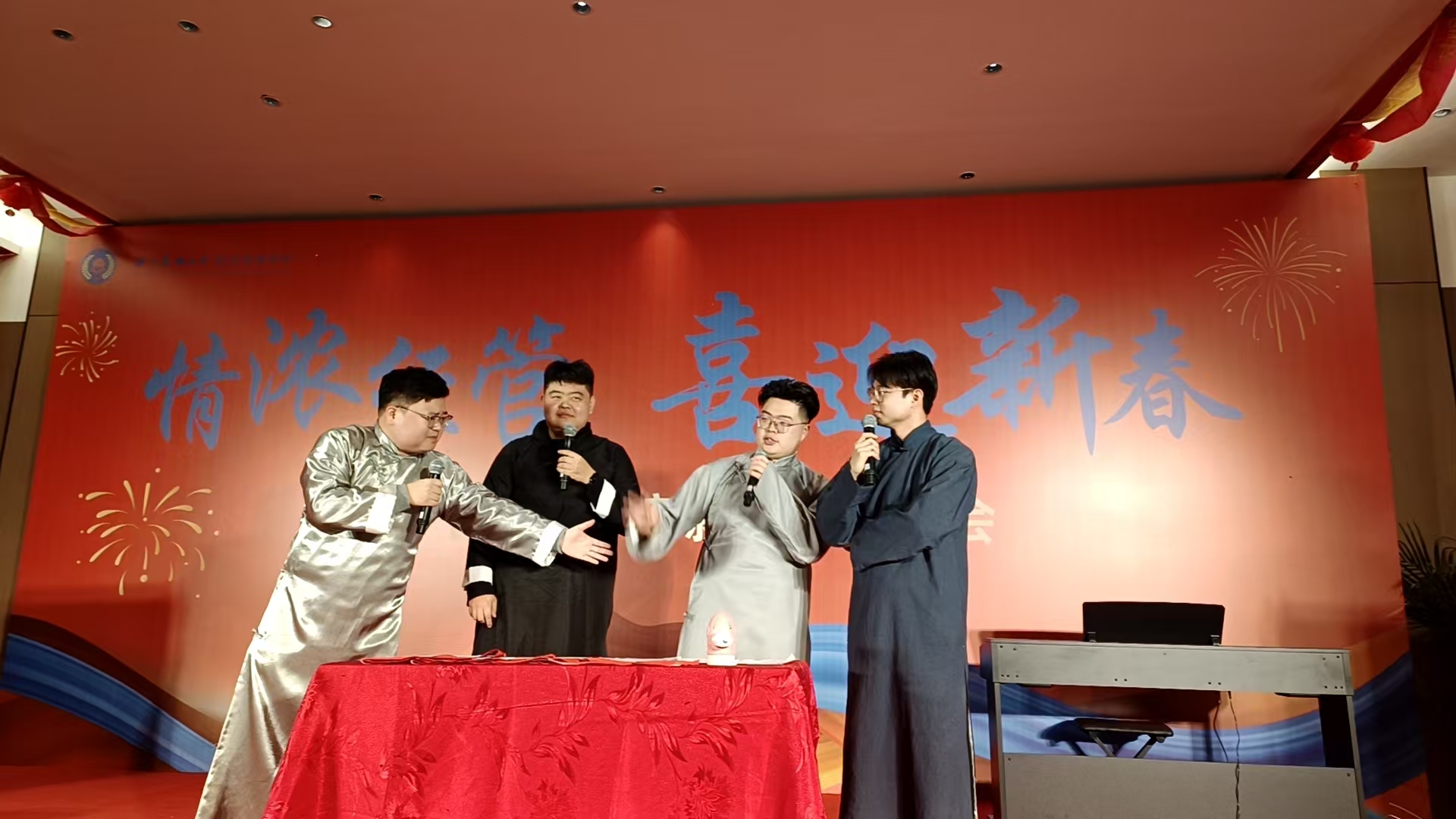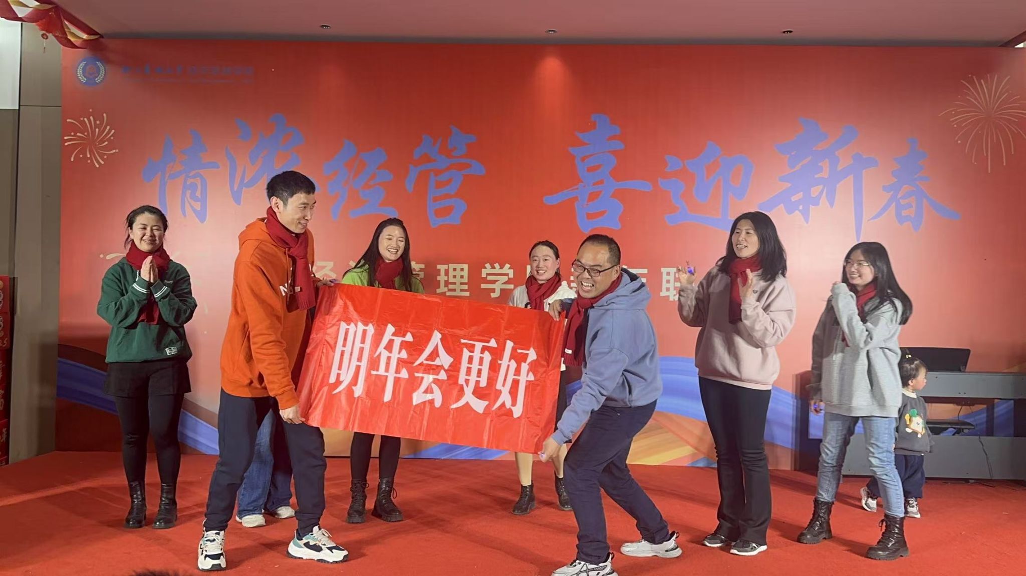 随着夜幕降临,联欢会正式拉开序幕,晚会内容丰富多彩,不仅有才艺展示,还有互动游戏和幸运抽奖等环节,让每一位参与者都能感受到家的温暖和集体的力量。首先登场的是新入职教师代表带来的祝福环节。他们用真挚的话语表达了对未来工作生活的美好憧憬以及对学院大家庭的感恩之情。
