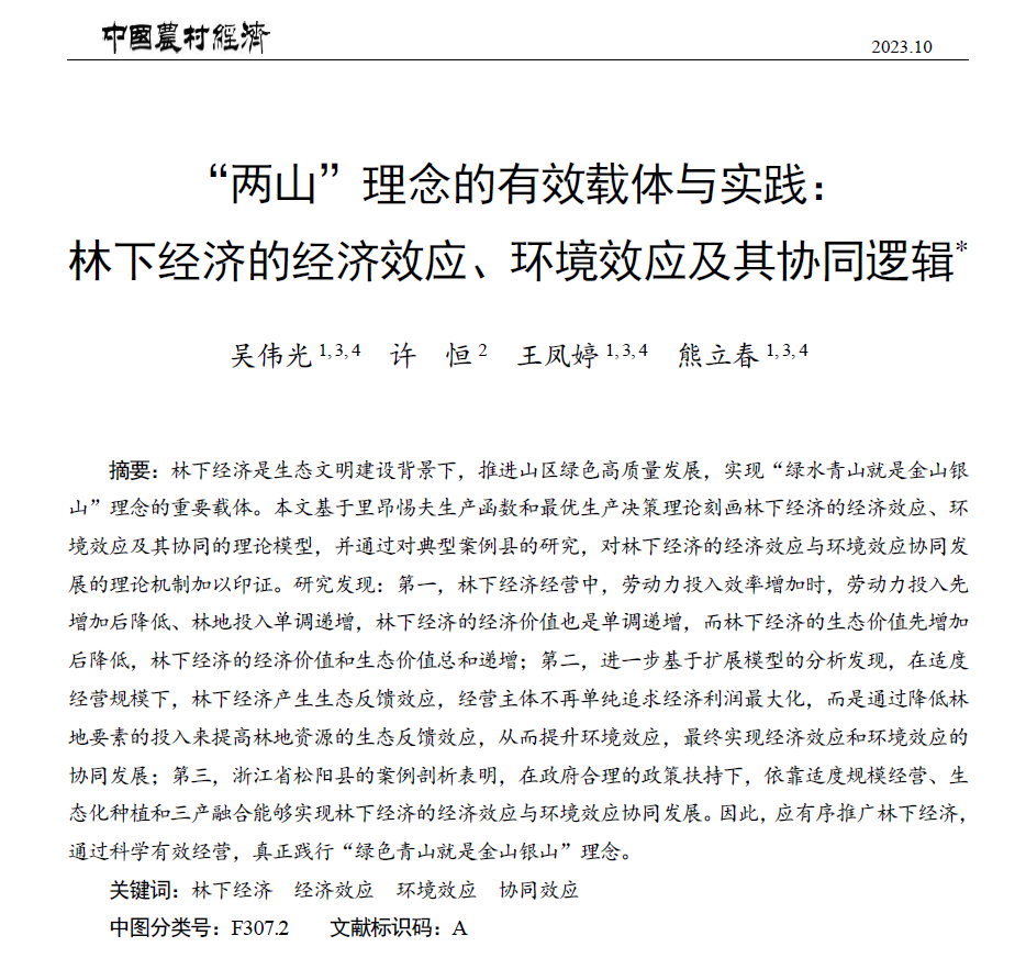 best365官网吴伟光教授团队研究成果在《中国农村经济》发表 近日,学院吴伟光教授团队的研究论文《“两山”理念的有效载体与实践:林下经济的经济效应、环境效应及其协同逻辑》在知名期刊《中国农村经济》2023年第10期发表。该文通过经济学模型推理和典型案例分析得出如下观点:证明了林下经济经营活动在创造经济价值的同时同样会创造生态价值,当林下经济所形成的生态价值有利于当地生态环境提升时,经营主体经营的林下经济及其周边生态环境的经济价值也会显现,即产生正向的生态反馈效...
