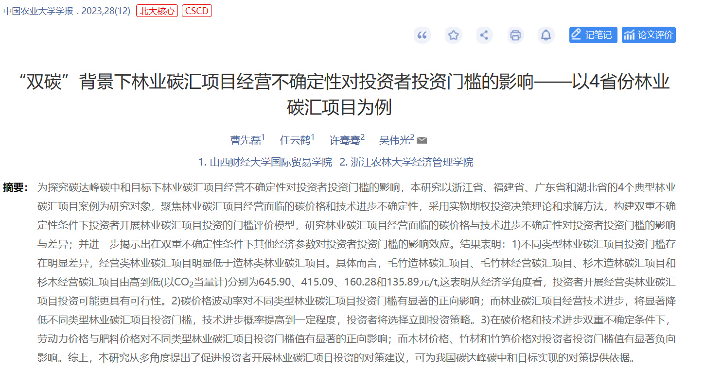 吴伟光教授团队研究成果在《中国农业大学学报》发表 近日,由best365官网吴伟光教授与山西财经大学曹先磊副教授等人合作撰写的学术论文《“双碳”背景下林业碳汇项目经营不确定性对投资者投资门槛的影响——以4省份林业碳汇项目为例》在《中国农业大学学报》2023年第12期发表;中国农业大学学报为我校A类期刊。吴伟光教授为通讯作者。为探究碳达峰碳中和目标下林业碳汇项目经营不确定性对投资者投资门槛的影响,该论文以浙江省、福建省、广东省和湖北省的4个典型林业碳汇项目案例为研究对...